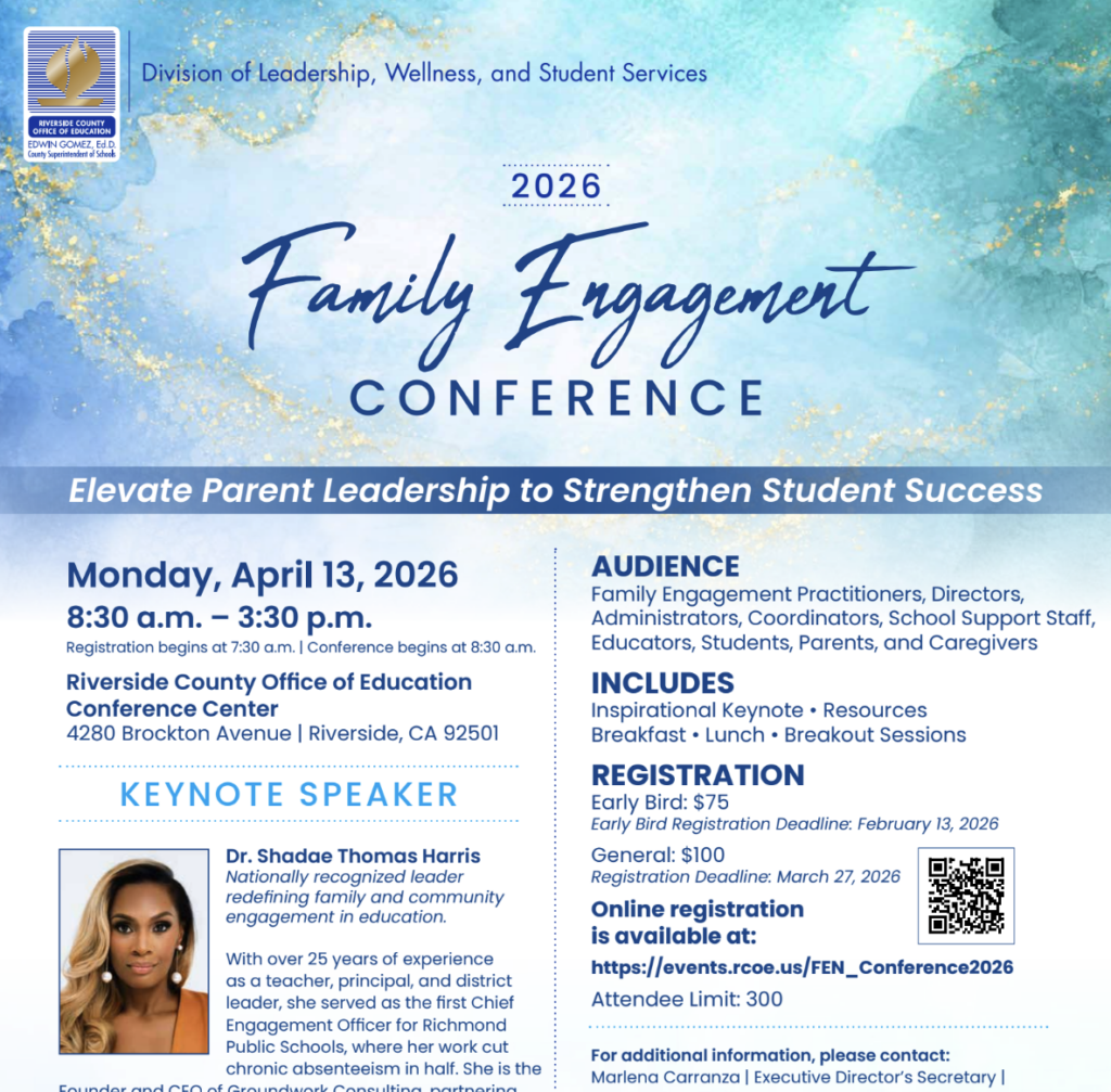 The Riverside County Office of Education invites families, educators, and community partners to attend the 2026 Family Engagement Conference on Monday, April 13, 2026. The event will bring together parents and education leaders for a day of dialogue, parent-led workshops, and opportunities to strengthen family-school partnerships across Riverside County. The conference will feature keynote speaker […]
